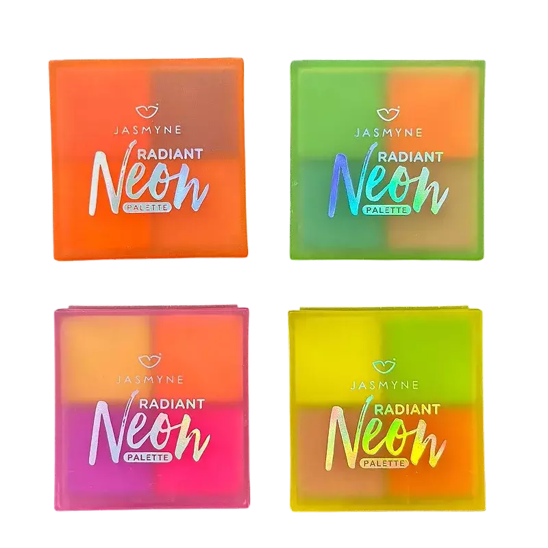Paleta Neon Radiant – JASMYNE Contém 4 paletas (cada paleta com 4 cores) Peso liquido total de cada paleta: 4g Modo de usar: Passe o pincel na cor desejada e aplique sobre a pálpebra móvel. Para efeito esfumado, aplique um tom mais intenso no côncavo e canto externo dos olhos. Finalize com a cor mais clara no cantinho interno para iluminar o olhar.