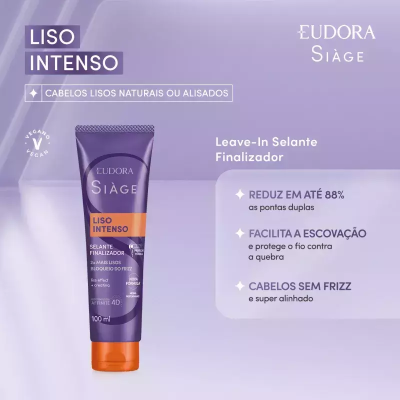 Eudora Siàge Liso Intenso possui fórmula inteligente que se adequa a lisos naturais, alisados ou com ondas indesejadas, proporcionando liso extremo por muito mais tempo. Seus produtos entregam hidratação, cuidados diários, cabelos 2x mais lisos e bloqueio do frizz.